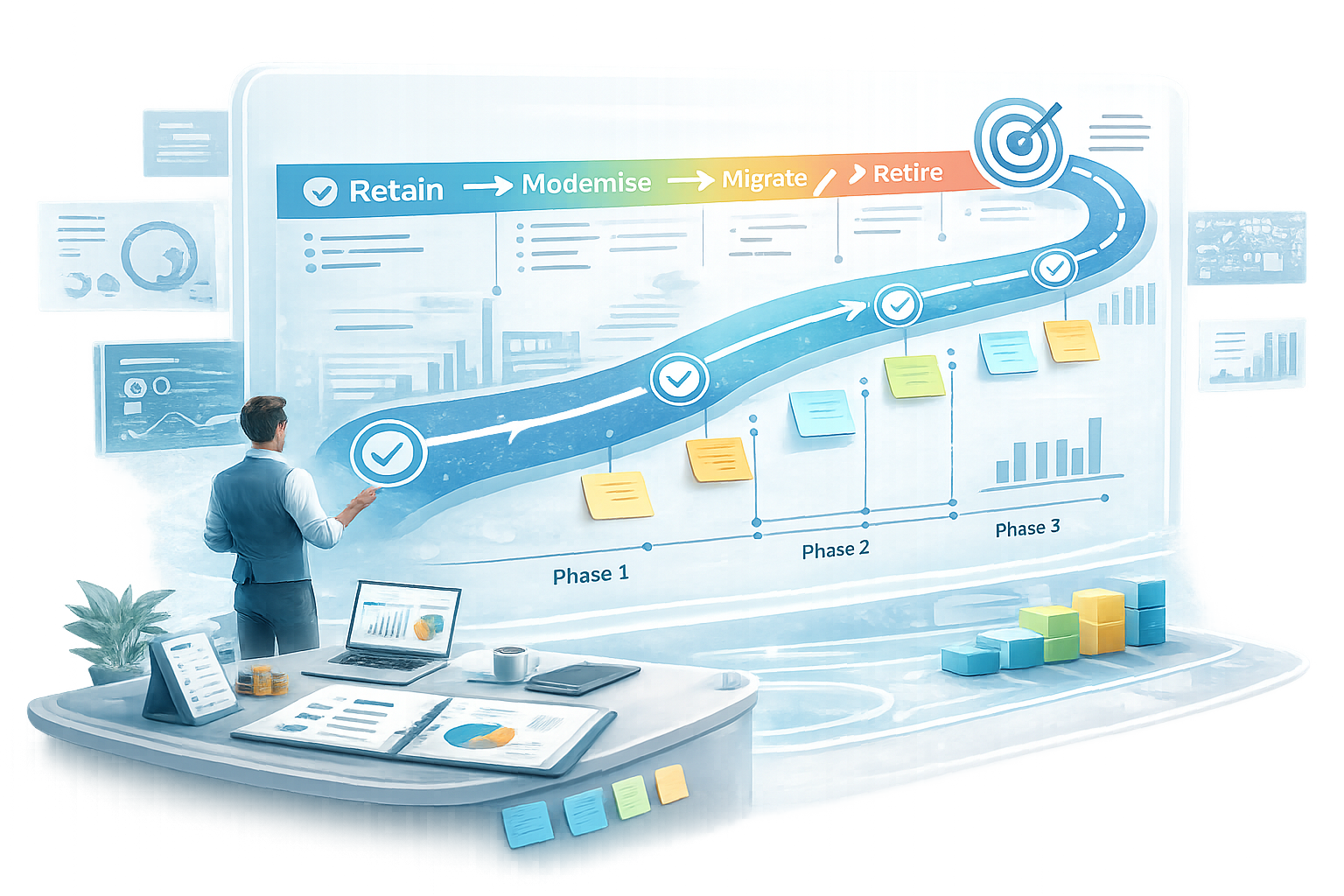 We translate discovery insights into structured transformation roadmaps, defining which applications should be modernised, migrated, retained, or retired based on real usage, complexity, and risk.